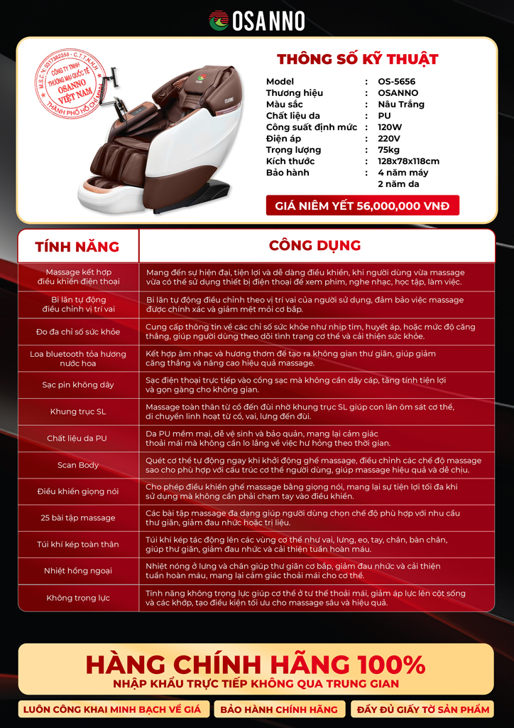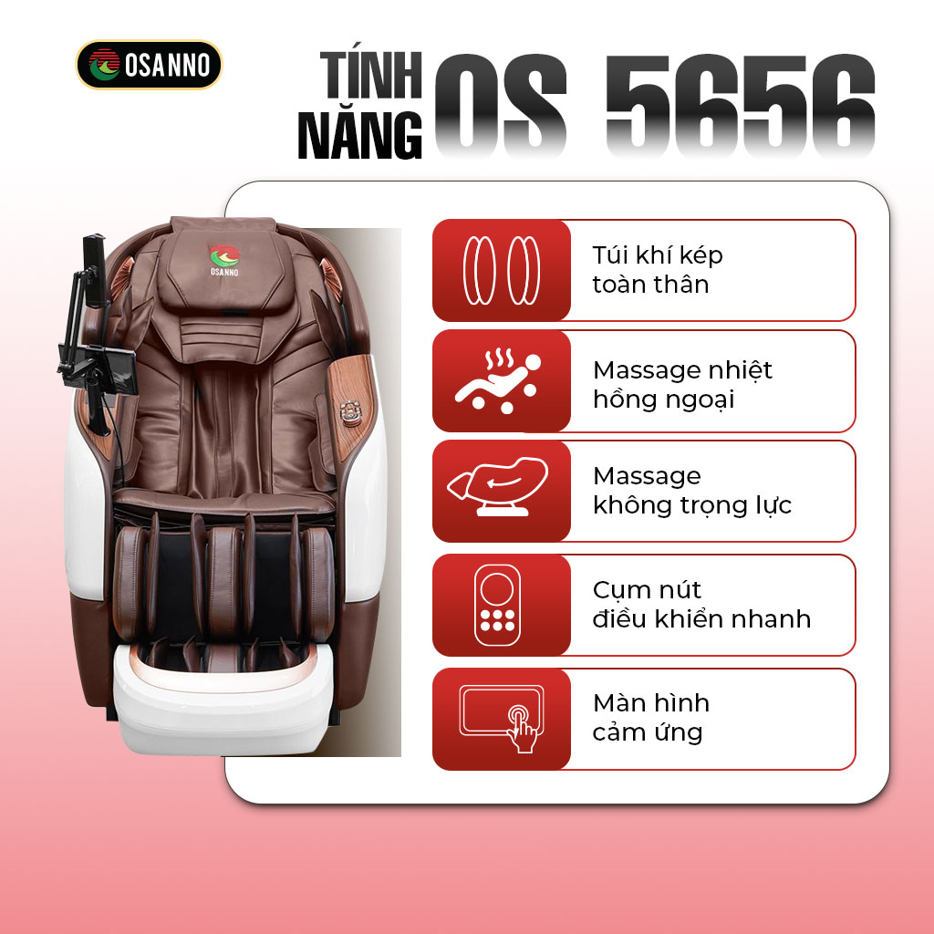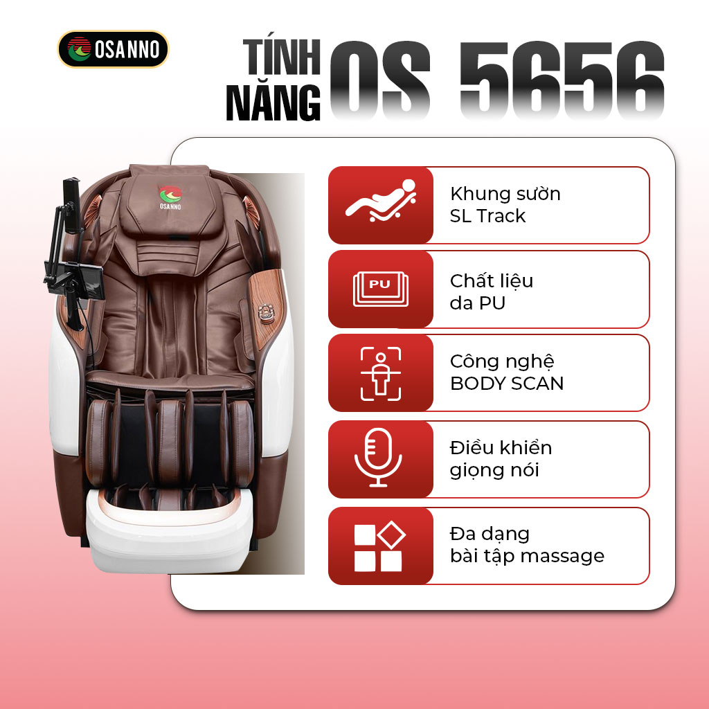 OS-5656 thuộc dòng ghế massage bán chạy chất lượng cao, được trang bị công nghệ hiện đại cùng tính năng chăm sóc sức khỏe chuyên sâu, mang đến trải nghiệm thư giãn đỉnh cao cho người dùng
