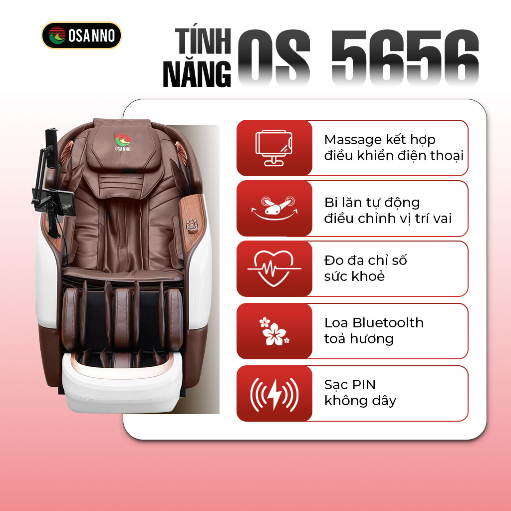OS-5656 không chỉ là một chiếc ghế massage thông thường, mà là một hệ thống chăm sóc sức khỏe toàn diện với trí tuệ nhân tạo. Nhờ tích hợp công nghệ điều khiển điện thoại thông minh, bi lăn tự động điều chỉnh vị trí, hệ thống đo chỉ số sức khỏe và loa bluetooth tỏa hương nước hoa, OS-5656 mang đến trải nghiệm massage đẳng cấp resort 5 sao ngay tại nhà, phù hợp với những khách hàng có yêu cầu cao về chất lượng cuộc sống.