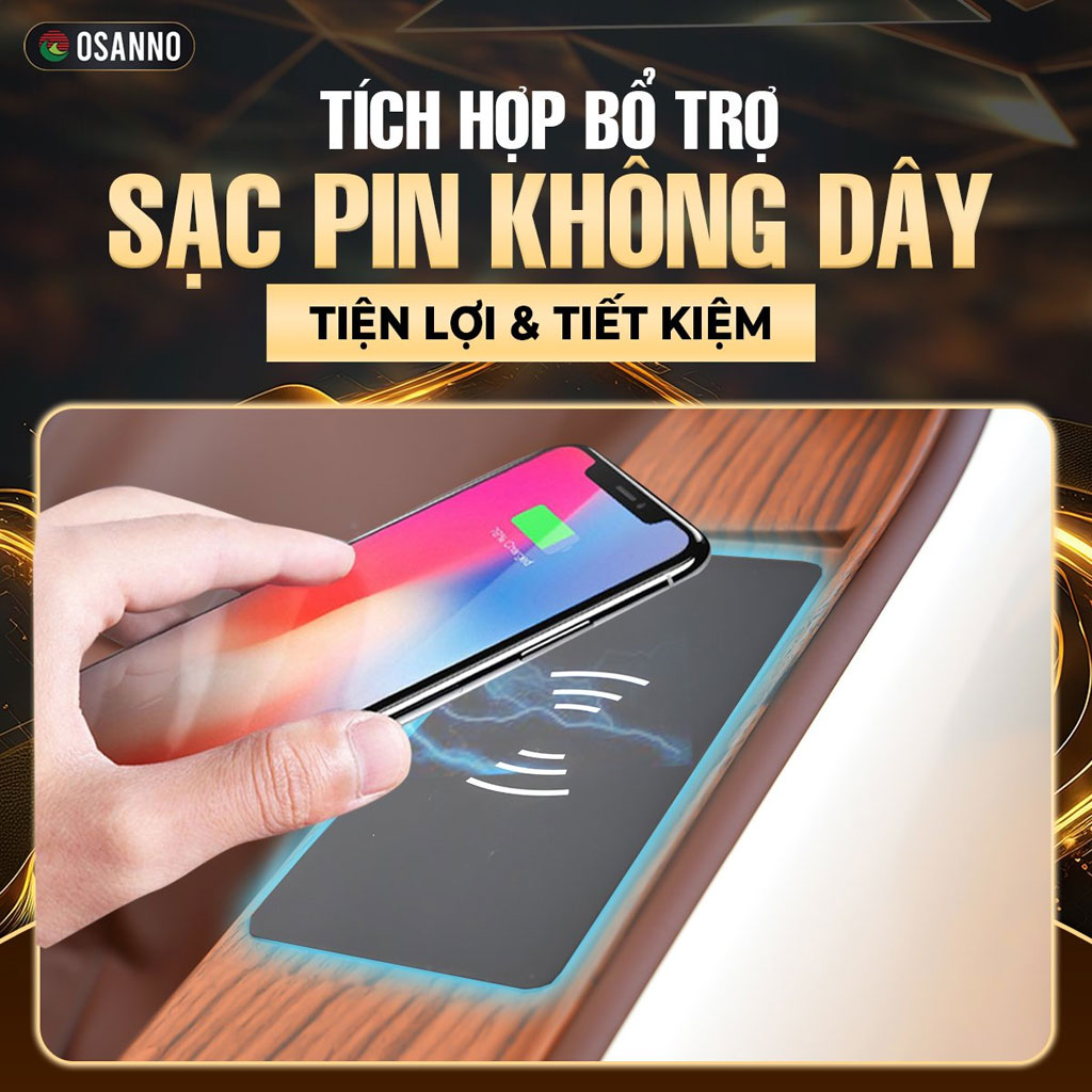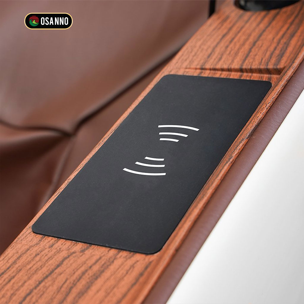 Tính năng sạc pin không dây tích hợp ngay trên tay ghế cho phép người dùng sạc điện thoại mà không cần cáp kết nối. Thiết kế thông minh này giúp duy trì kết nối liên tục với ứng dụng điều khiển, đồng thời tạo ra không gian gọn gàng, không bị cản trở bởi dây cáp trong suốt quá trình massage.