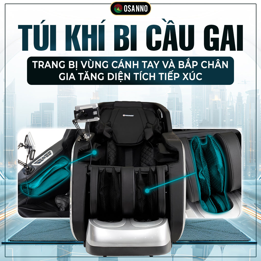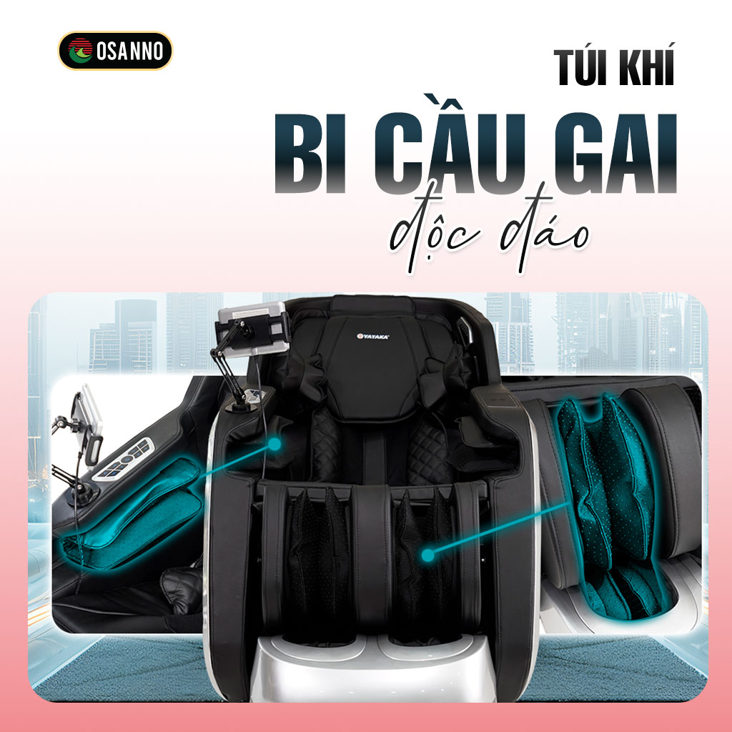Hệ thống túi khí được bố trí dày đặc tại cánh tay, bắp chân. Điểm đặc biệt là bên trong túi khí bắp chân có trang bị bi cầu gai. Khi túi khí bóp nhả nhịp nhàng theo cơ chế nén khí, các bi gai này sẽ kích thích sâu vào huyệt đạo, tăng diện tích tiếp xúc và thúc đẩy lưu thông máu tốt hơn so với túi khí thường.